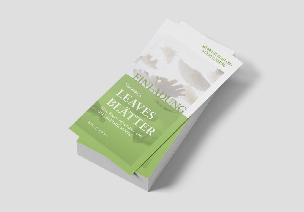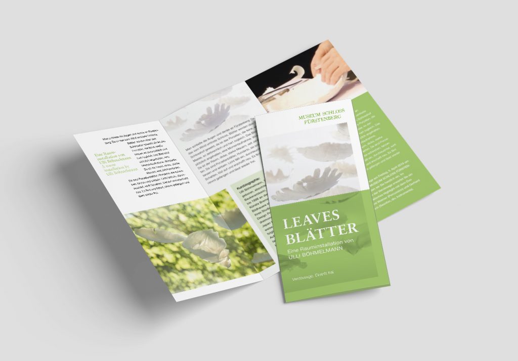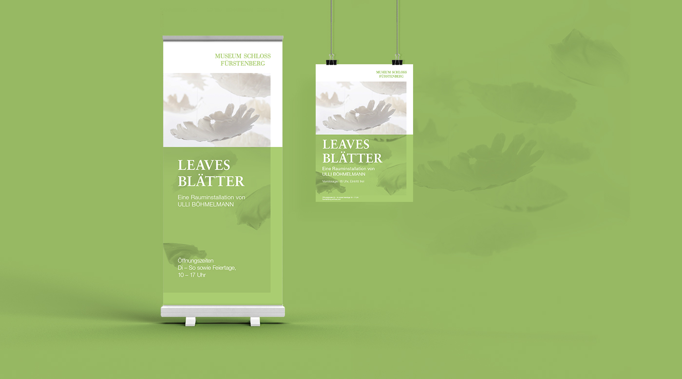 Für die Sonderausstellung im Jahr 2019 im MUSEUM SCHLOSS FÜRSTENBERG wurden Marketingmaterialien für die Ausstellung im Einklang mit dem vorgegebenen Corporate Design erstellt. Gezeigt wurde eine filigrane Rauminstallation von hunderten schwebenden Porzellanblättern, die von der Künstlerin Ulli Böhmelmann individuell kreiert wurden. Die Gestaltung des Keyvisuals sollte die Zartheit der Installation widerspiegeln und visuell umsetzen.