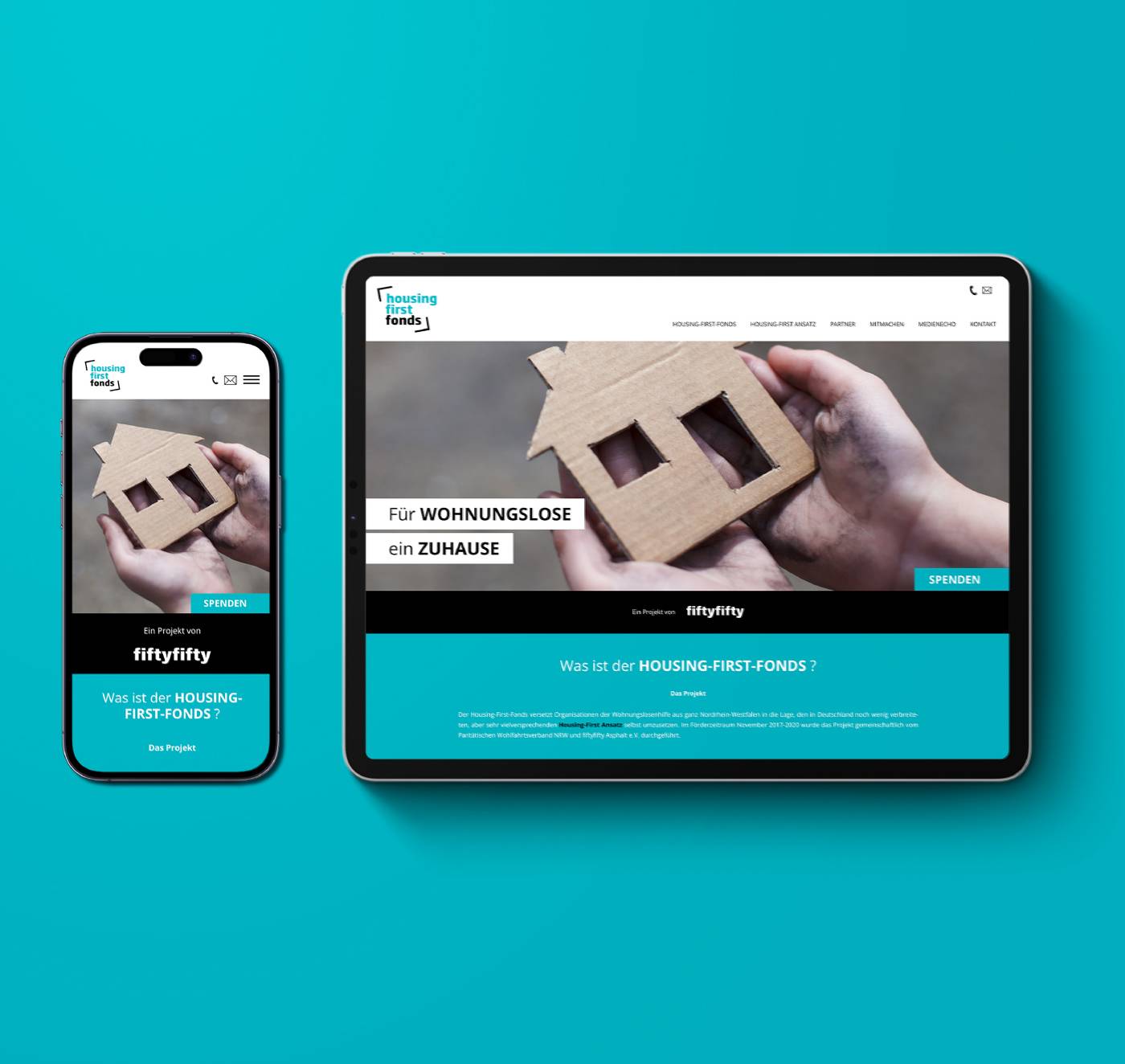 Neugestaltung des Logos sowie Konzeption und Design der Website des Housing-First-Fonds. Freiberufliches Projekt in Zusammenarbeit mit Heike Hassel und Danke, der Agentur für Nonprofits und karitatives Engagement. Der Housing-First-Fonds ist ein Projekt von fiftyfifty/Asphalt eV und wurde von 10/2017 bis 10/2020 als Gemeinschaftsprojekt unter der Trägerschaft des Paritätischen NRW durchgeführt.